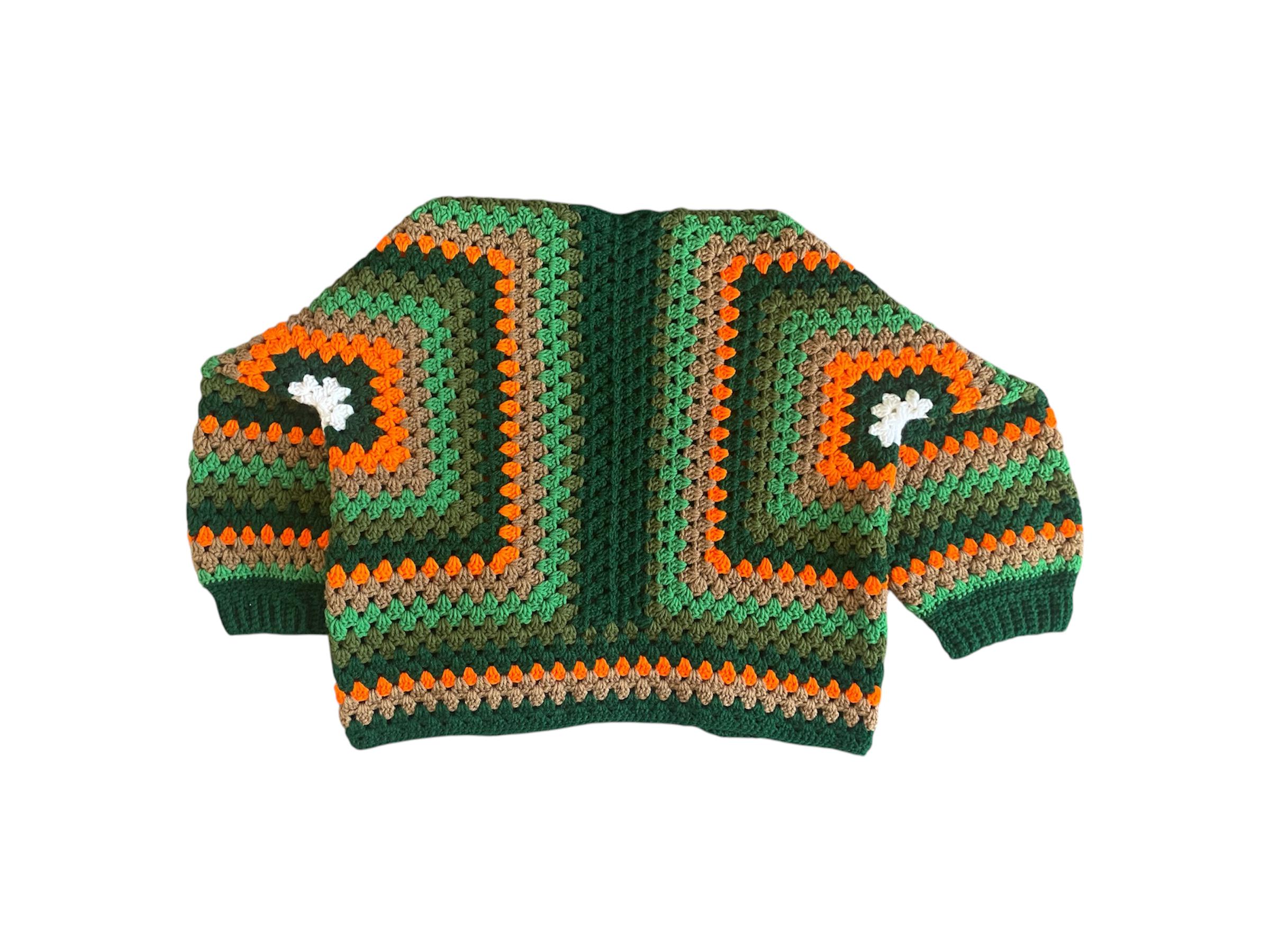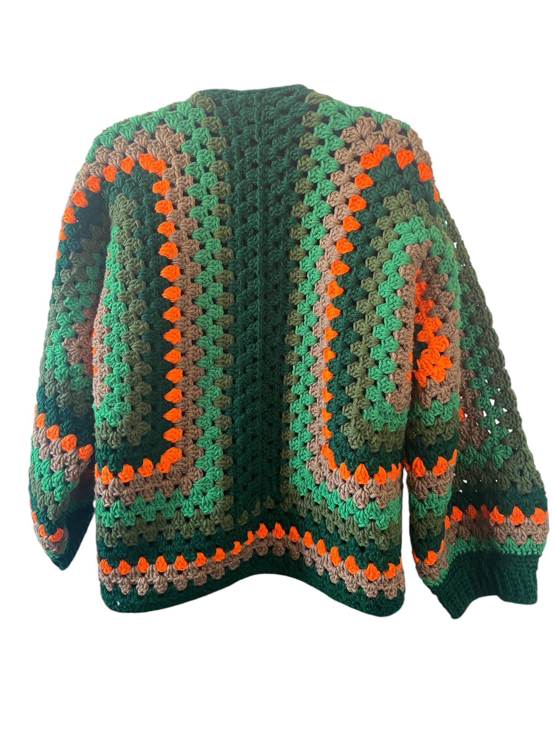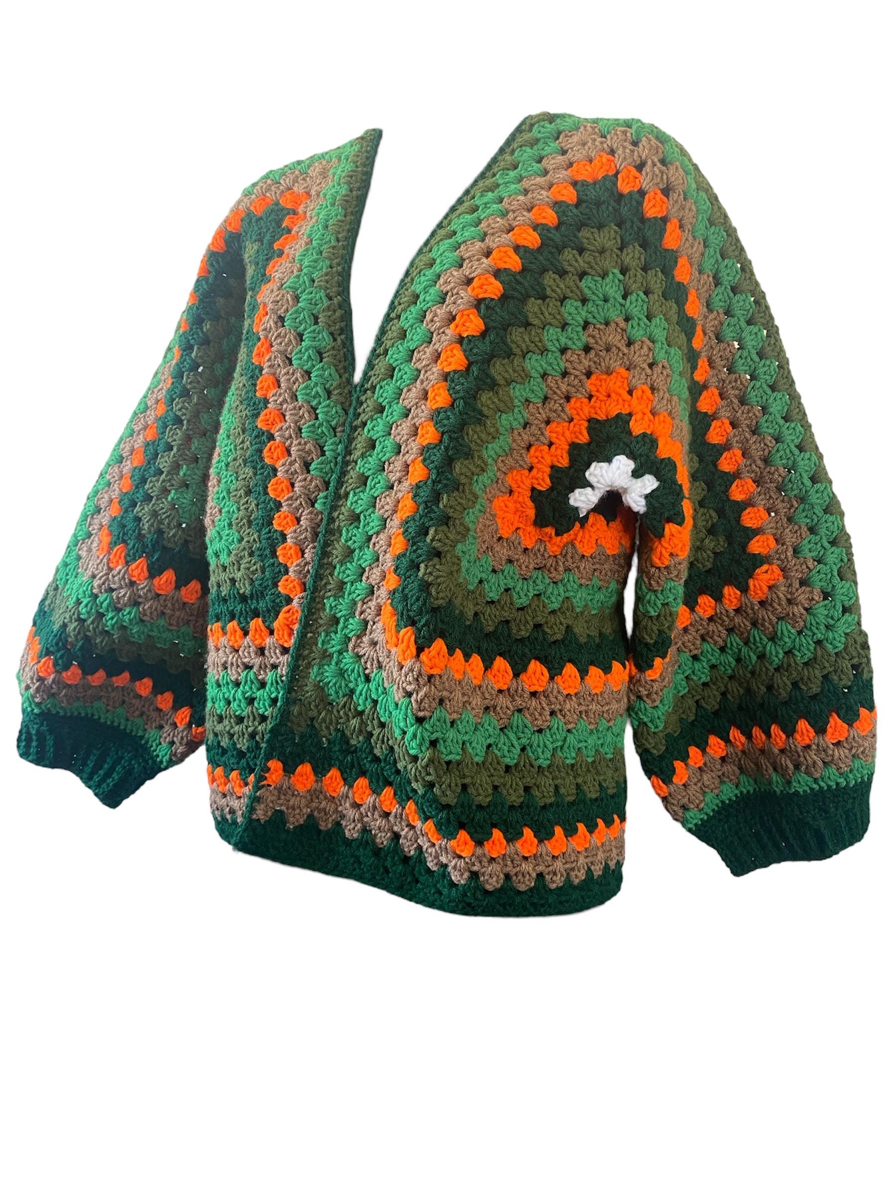 This exquisite cardigan jacket features a harmonious crochet pattern, intertwining shades of white, dark green, orange, brown, green, and olive, embodying a sophisticated yet earthy aesthetic for the discerning fashionista.