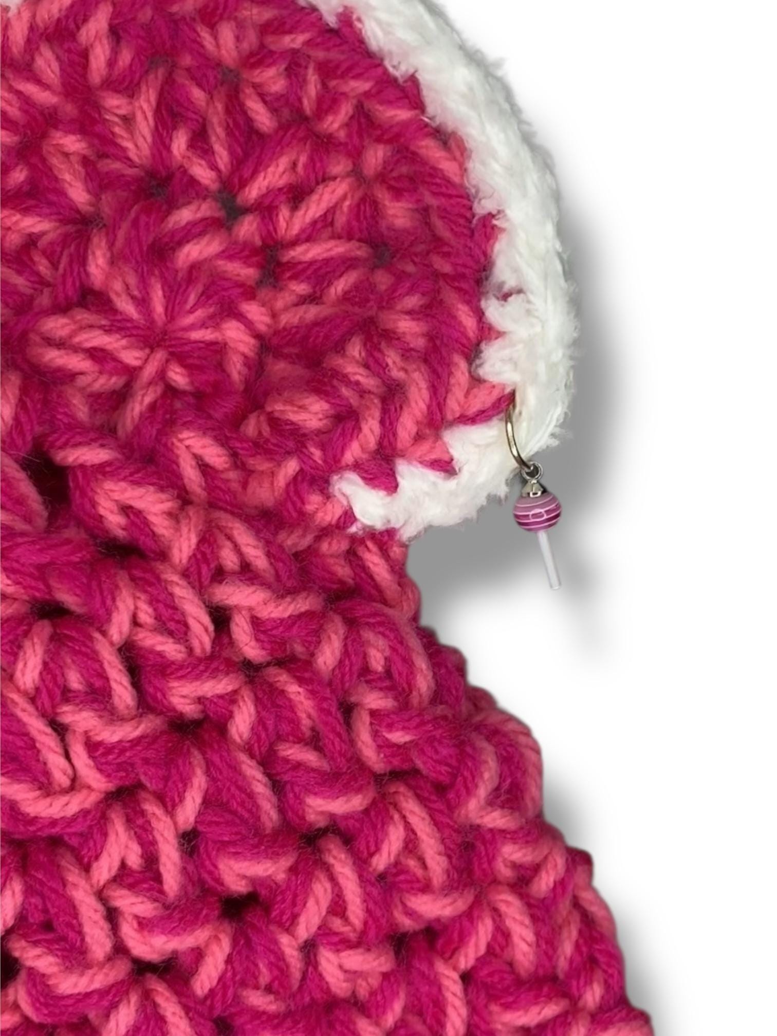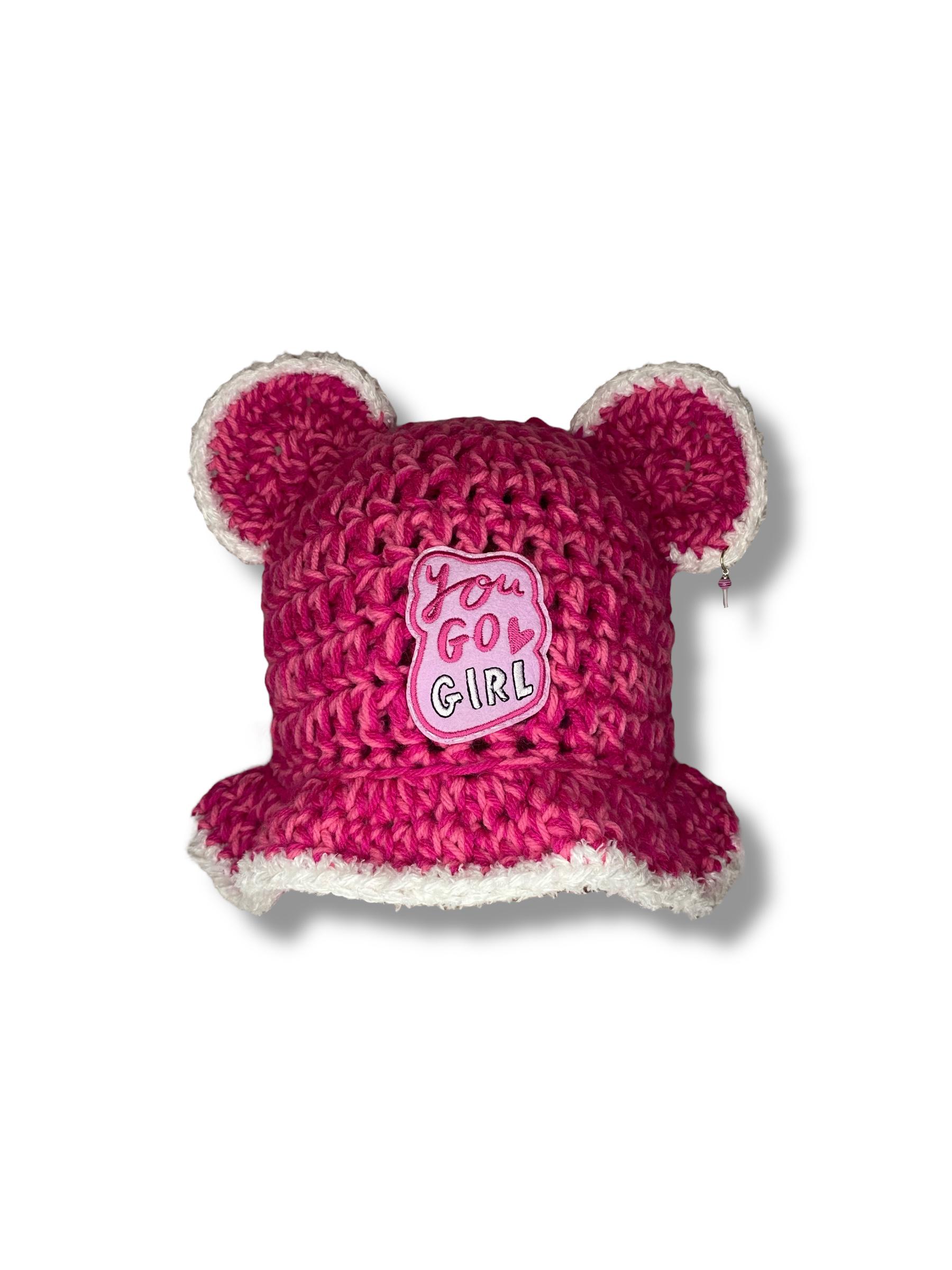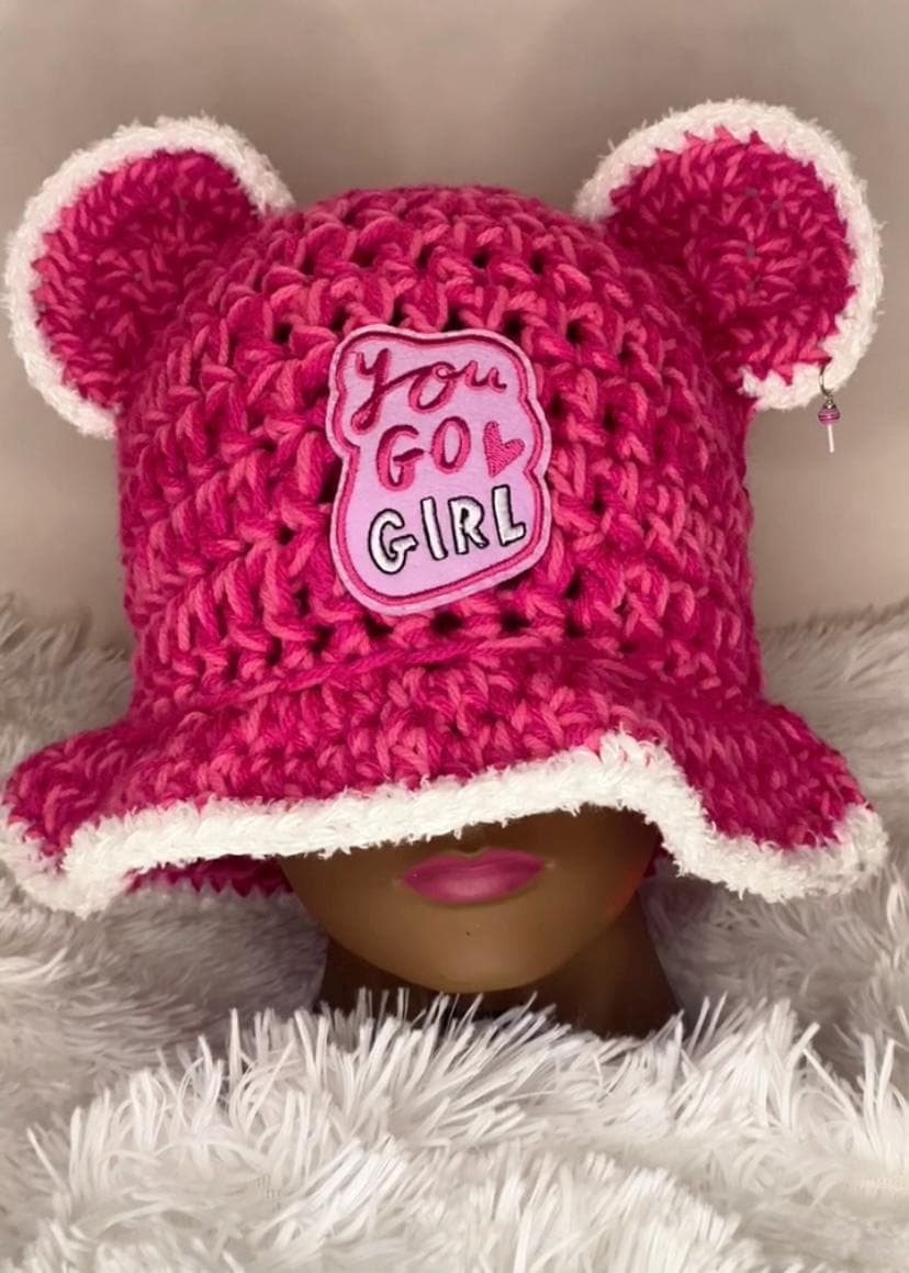 đź’– You Go Girl is all about playful confidence. Made with double pink yarn, a crisp white brim, and signature bear ears, this one-of-a-kind crochet hat is finished with a bold patch + charm that celebrates feminine energy and empowerment.