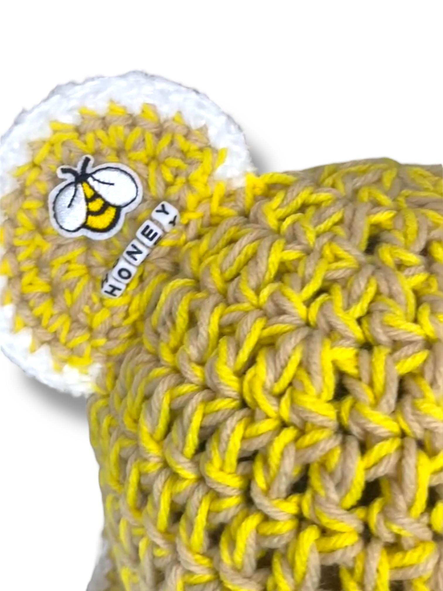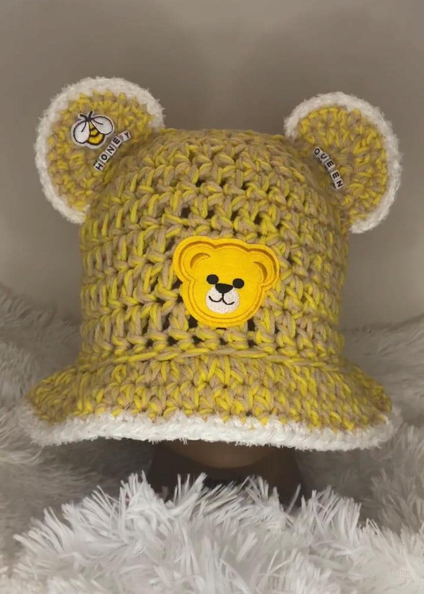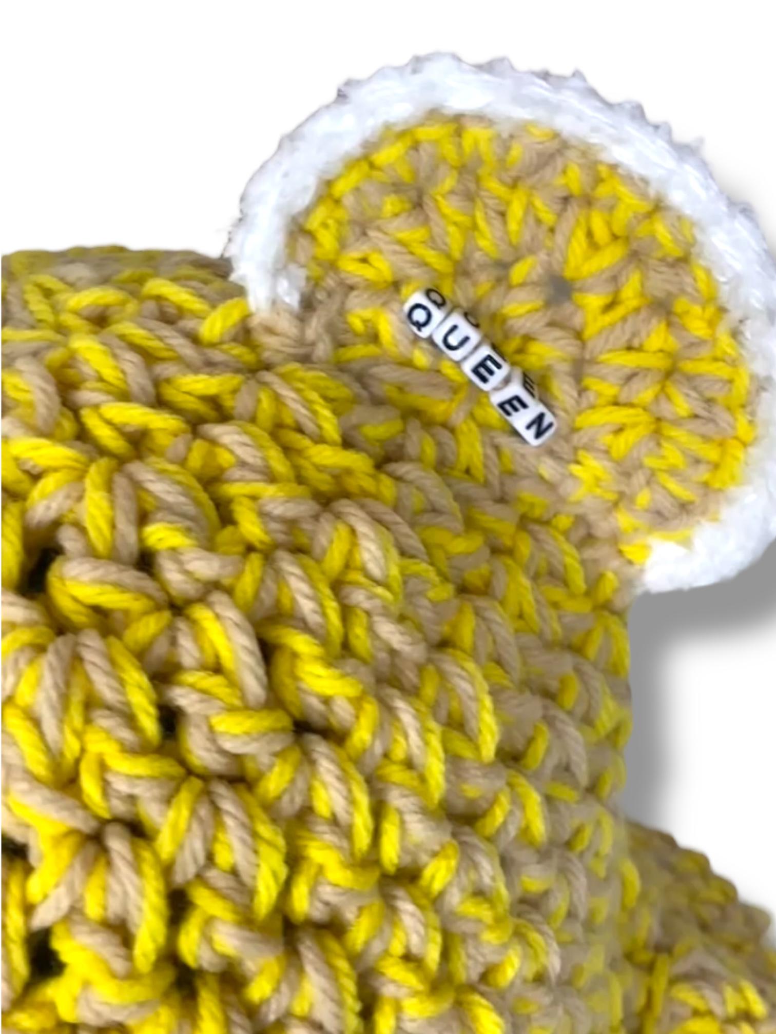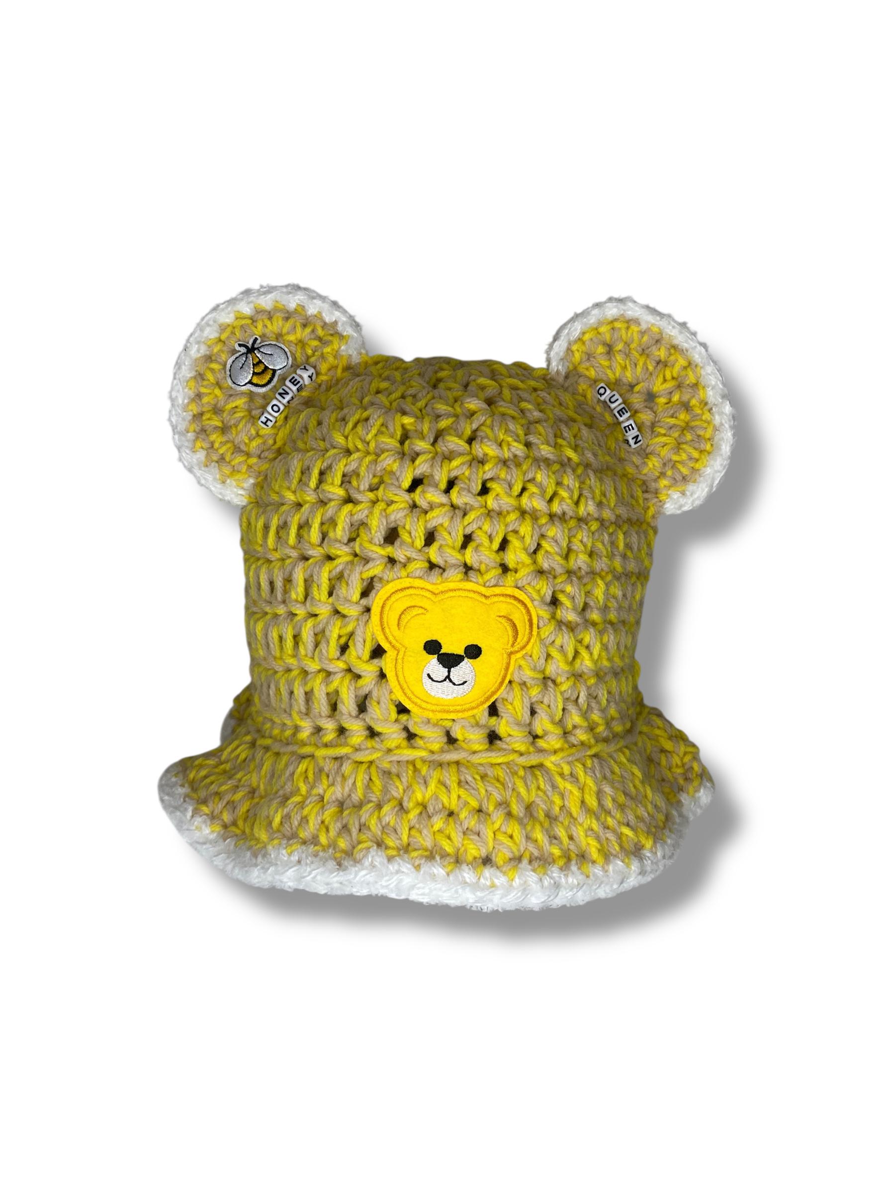 👑🍯 Sweet yet powerful, the Honey Queen is stitched in golden yellow and tan yarn with a crisp white brim. Finished with bear ears and royal-inspired details, this crown-worthy hat celebrates playful confidence.