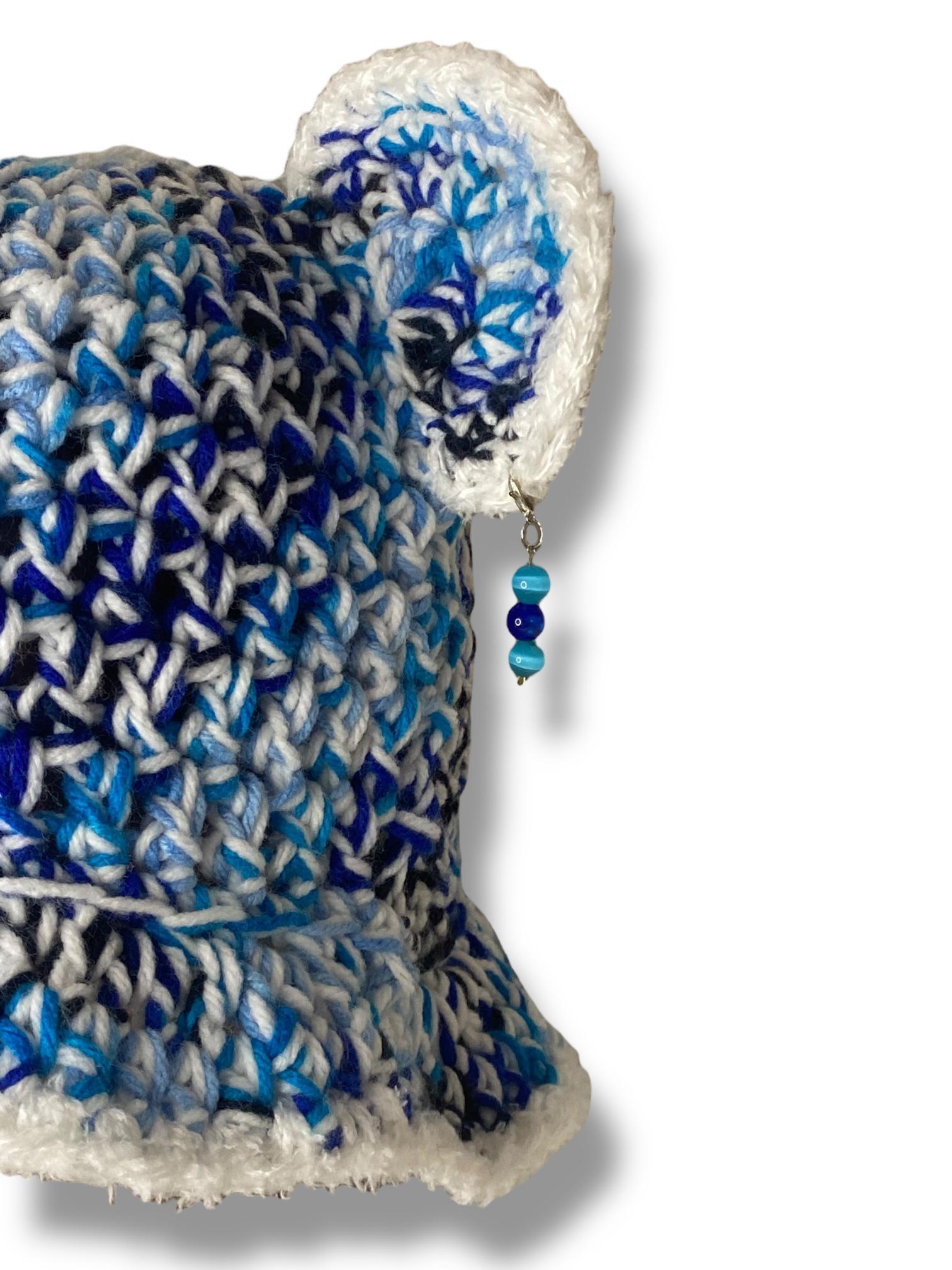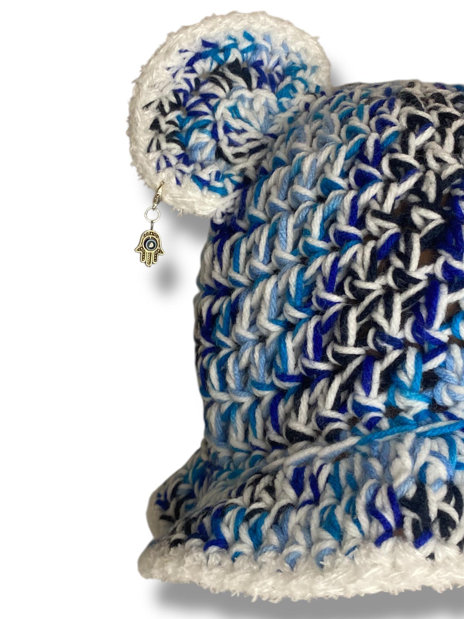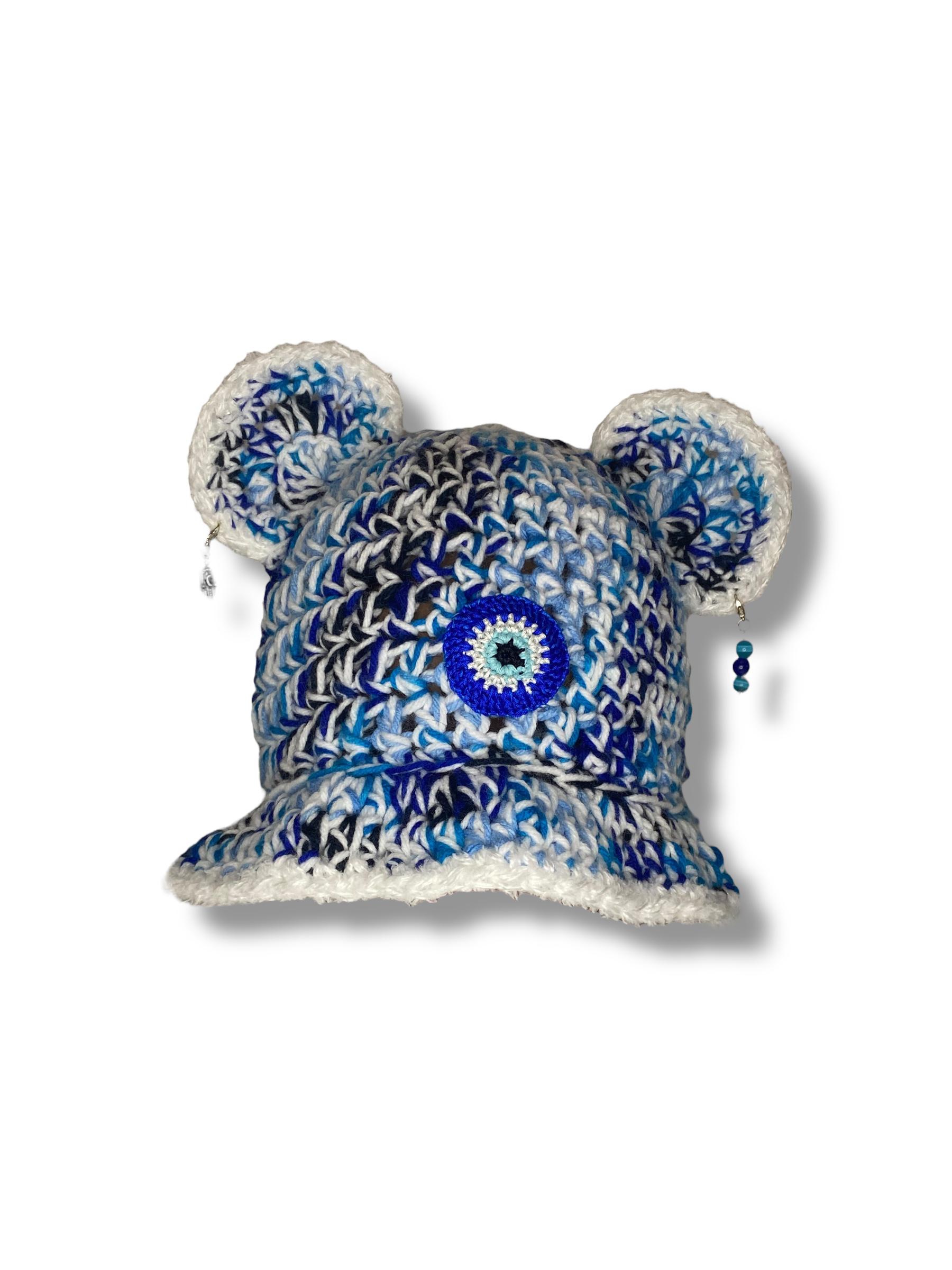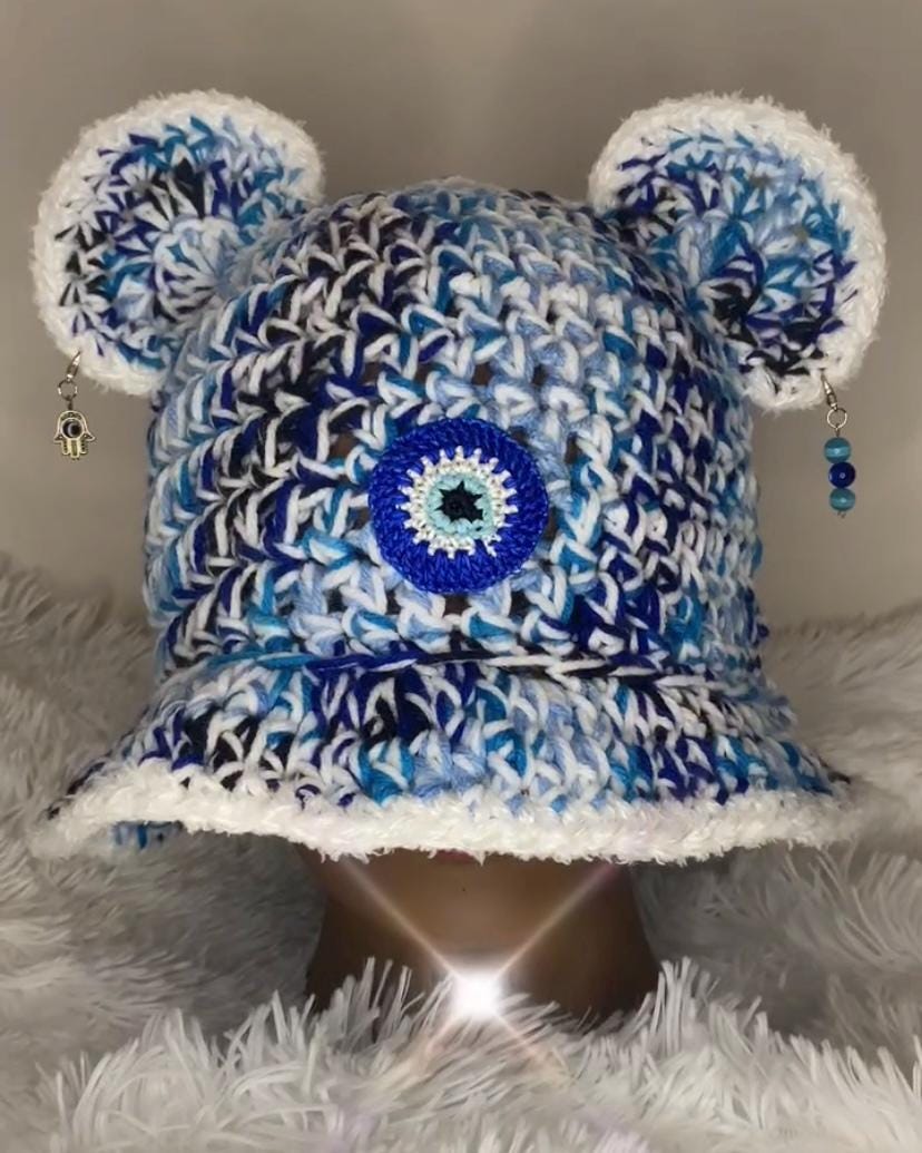 🔵🧿 A symbol of protection with a stylish edge — Evil Eye combines blue + black yarn with a crisp white brim and bear ears. Finished with a handmade evil eye crochet patch for extra charm and energy.