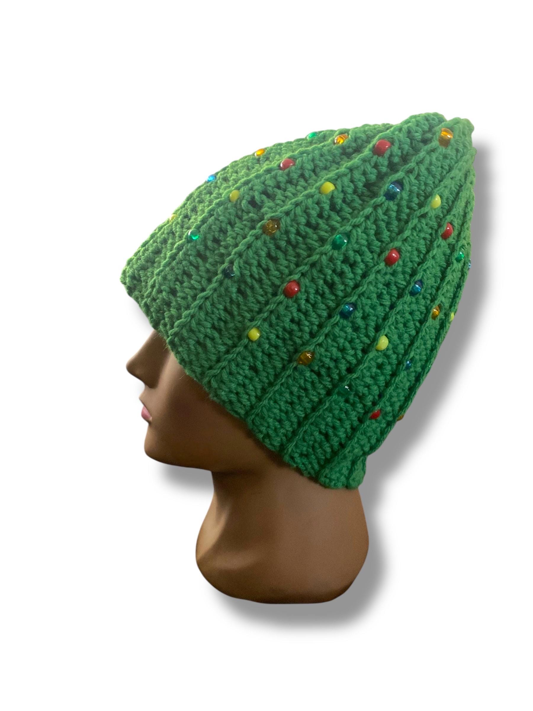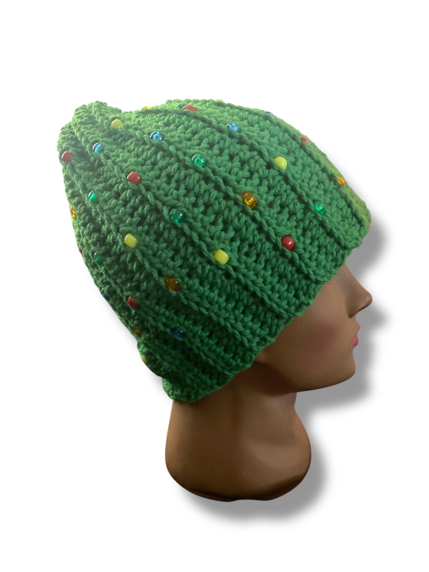 Hand-crocheted with soft acrylic yarn and finished with colorful “light” beads, this beanie is the perfect festive accessory for the winter season.