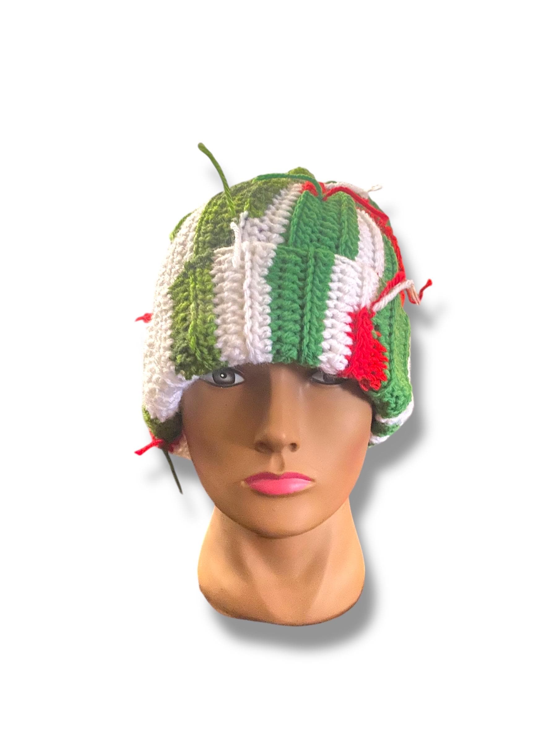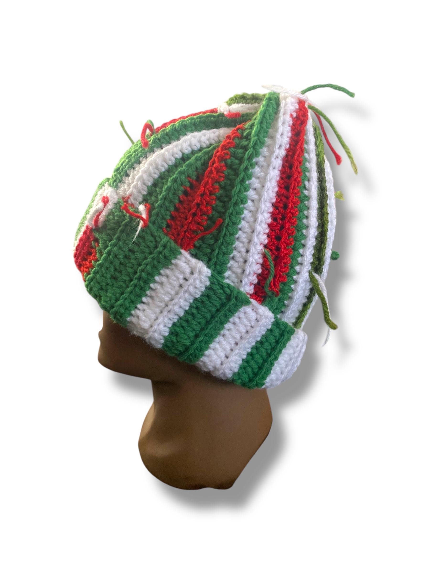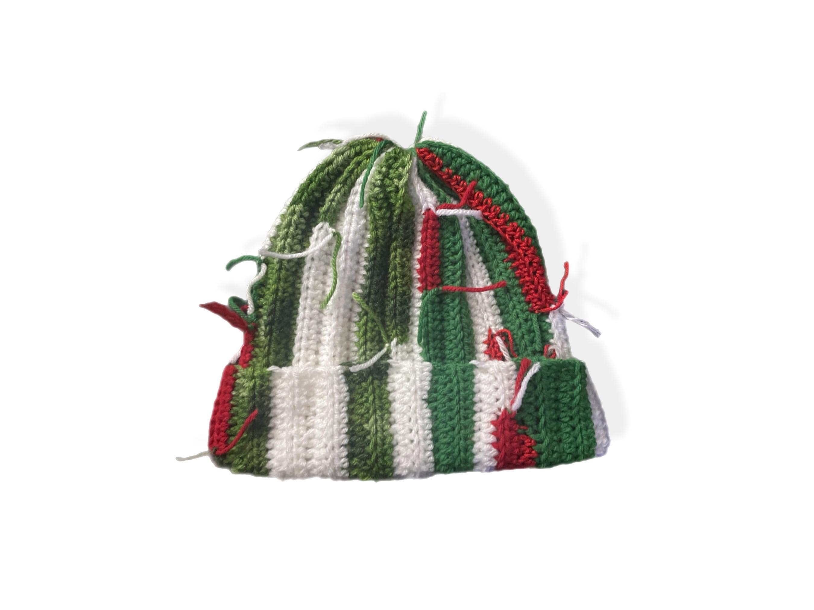A unique holiday beanie made using scrap yarn from the Christmas Collection — making each one completely one-of-a-kind.